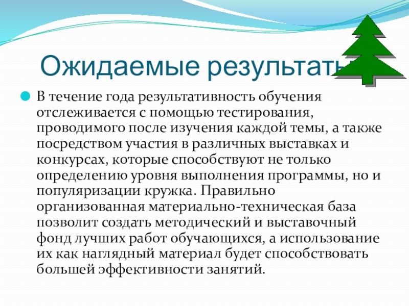 тестирования, проводимого после изучения каждой темы, а также посредством участия в различных выставках и конкурсах, которые способствуют не только определению уровня выполнения программы, но и популяризации кружка. Правильно организованная материально-техническая база позволит создать методический и выставочный фонд лучших работ обучающихся, а использование их как наглядный материал будет способствовать большей эффективности занятий.