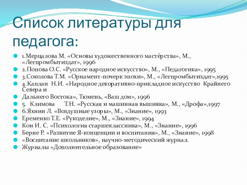 1.Мерцалова М. «Основы художественного мастёрства», М., «Легпромбытиздат», 1996