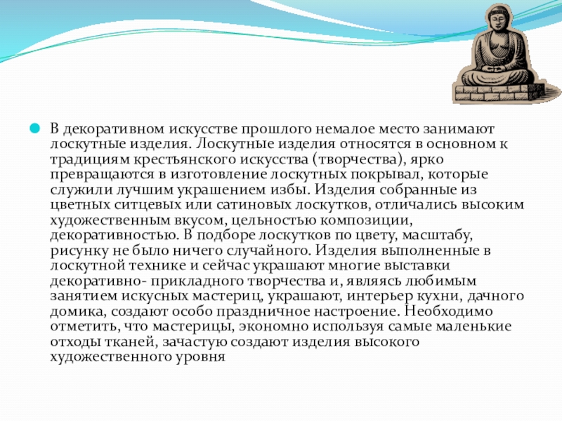 Слайд 6В декоративном искусстве прошлого немалое место занимают лоскутные изделия. Лоскутные изделия