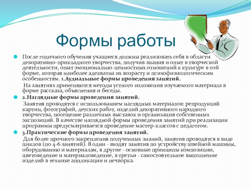 должны реализовать себя в области декоративно-прикладного творчества, получив знания и опыт в творческой деятельности, опыт эмоционально-ценностных отношений к культуре в той форме, которая наиболее адекватна их возрасту и психофизиологическим особенностям. 1.Аудиальные формы проведения занятий.