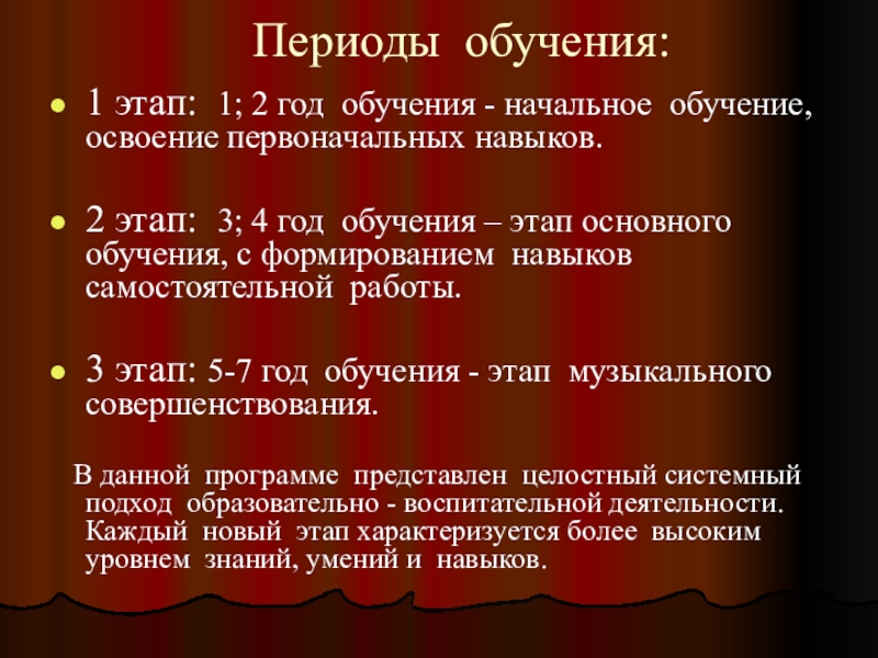 2 этап: 3; 4 год обучения – этап основного обучения, с формированием навыков самостоятельной работы.