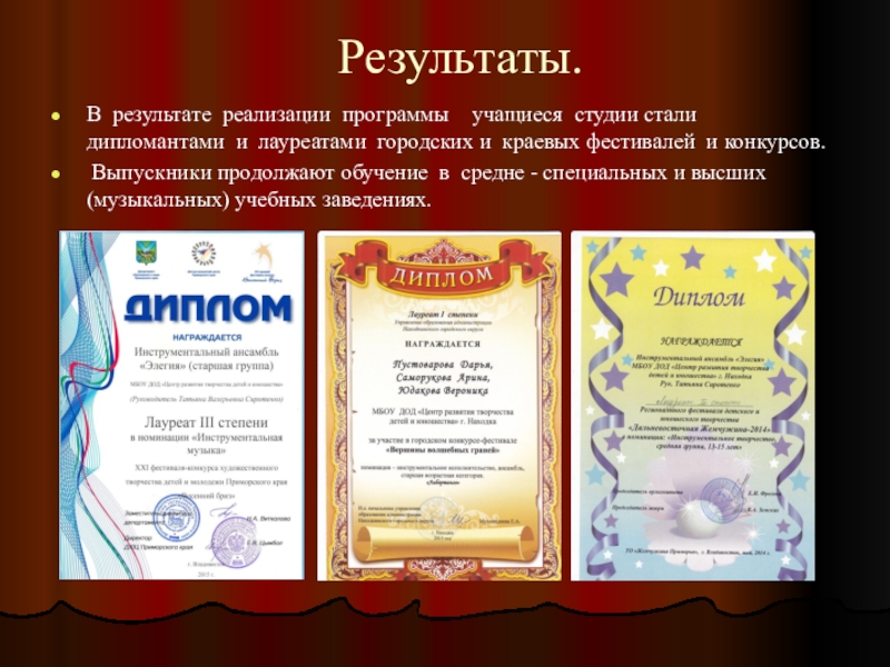 В результате реализации программы учащиеся студии стали дипломантами и лауреатами