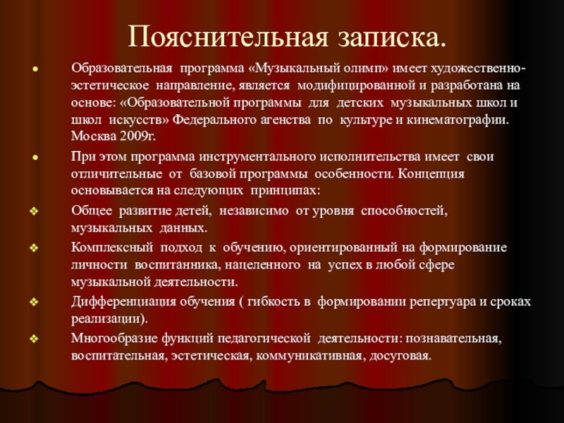 При этом программа инструментального исполнительства имеет свои отличительные от базовой программы особенности. Концепция основывается на следующих принципах:
