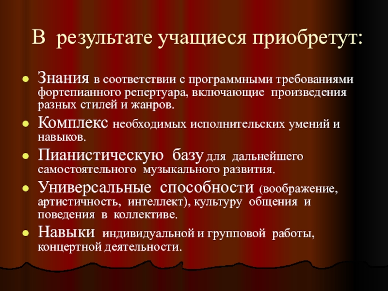 Навыки индивидуальной и групповой работы, концертной деятельности.