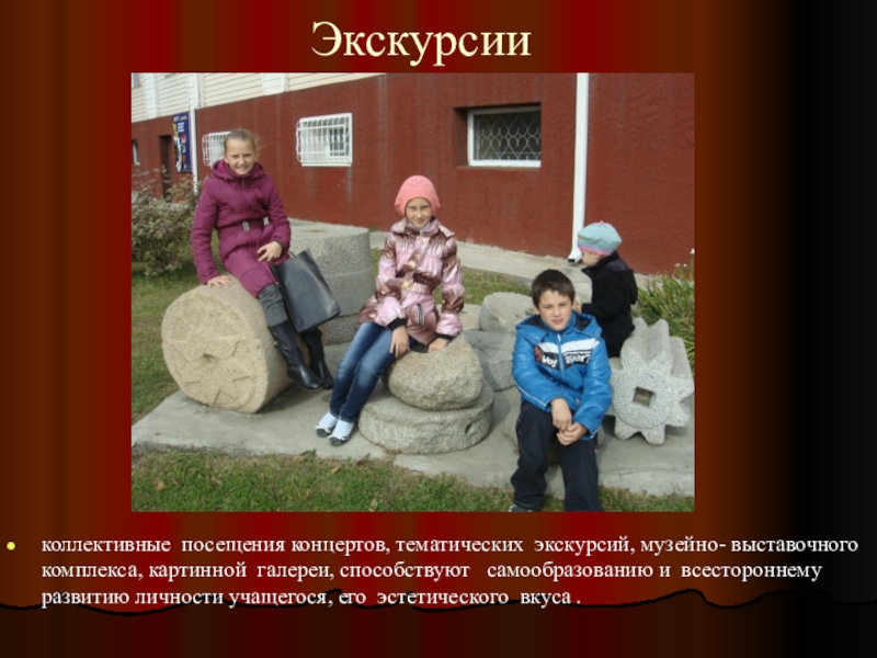 коллективные посещения концертов, тематических экскурсий, музейно- выставочного комплекса, картинной галереи, способствуют