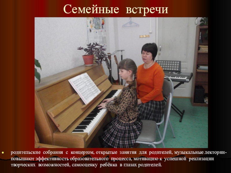 родительские собрания с концертом, открытые занятия для родителей, музыкальные лектории-
