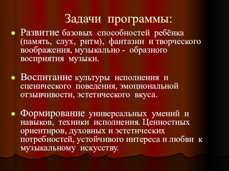 Воспитание культуры исполнения и сценического поведения, эмоциональной отзывчивости, эстетического вкуса.