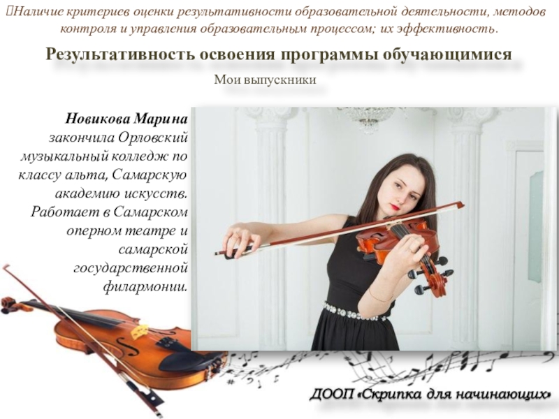 Новикова Марина закончила Орловский музыкальный колледж по классу альта, Самарскую академию искусств. Работает в Самарском оперном театре и самарской государственной филармонии.