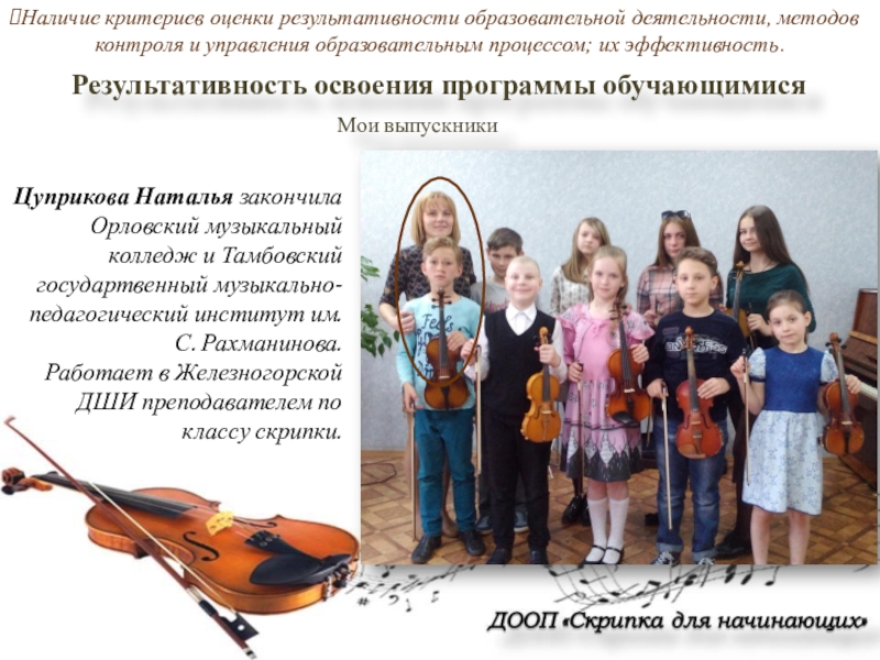 Работает в Железногорской ДШИ преподавателем по классу скрипки.