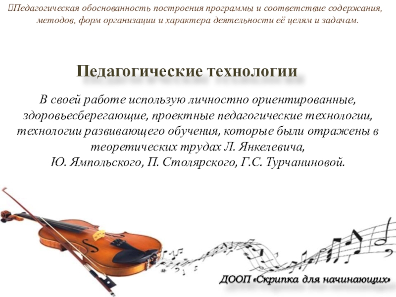 В своей работе использую личностно ориентированные, здоровьесберегающие, проектные педагогические технологии, технологии развивающего обучения, которые были отражены в теоретических трудах Л. Янкелевича,