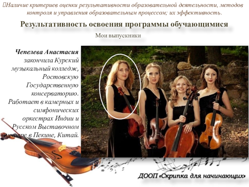 Чепелева Анастасия закончила Курский музыкальный колледж, Ростовскую Государственную консерваторию. Работает в камерных и симфонических оркестрах Индии и Русском Выставочном центре в Пекине, Китай.