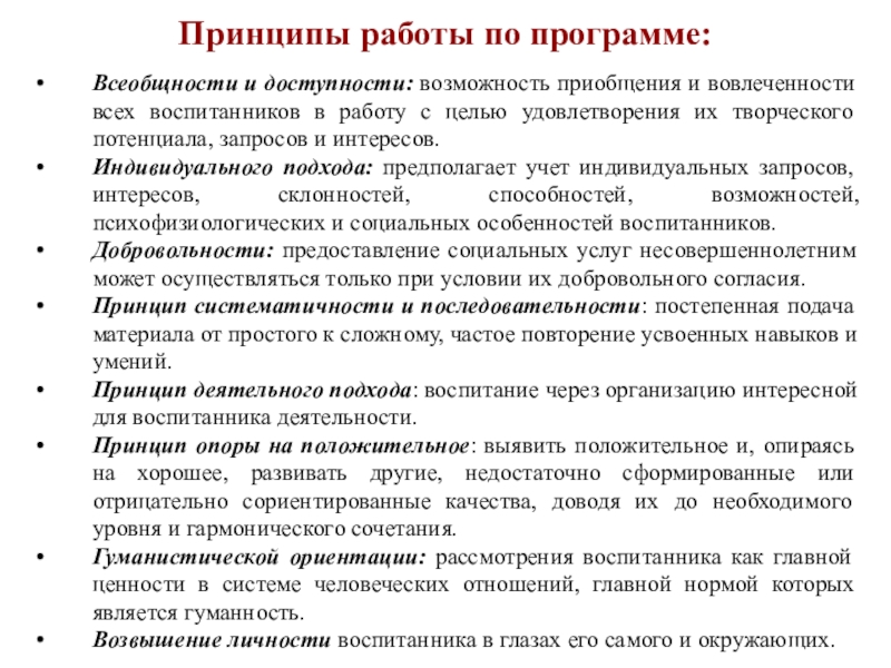 Индивидуального подхода: предполагает учет индивидуальных запросов, интересов, склонностей, способностей, возможностей, психофизиологических и социальных особенностей воспитанников.