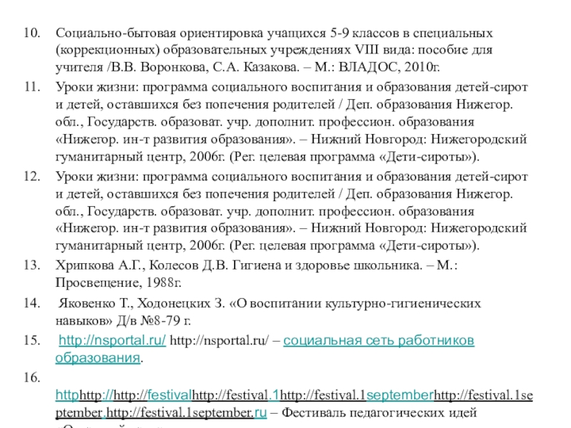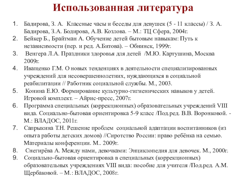Социально-бытовая ориентировка в специальных (коррекционных) образовательных учреждениях VIII вида: пособие для учителя /Под.ред. А.М. Щербаковой. – М.: ВЛАДОС, 2008г.