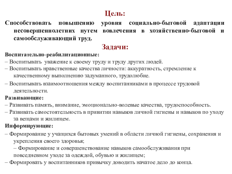 Способствовать повышению уровня социально-бытовой адаптации несовершеннолетних путем вовлечения в хозяйственно-бытовой и