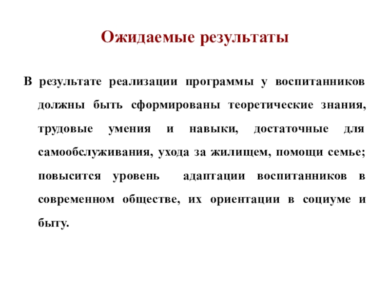 знания, трудовые умения и навыки, достаточные для самообслуживания, ухода за жилищем, помощи семье; повысится уровень адаптации воспитанников в современном обществе, их ориентации в социуме и быту.