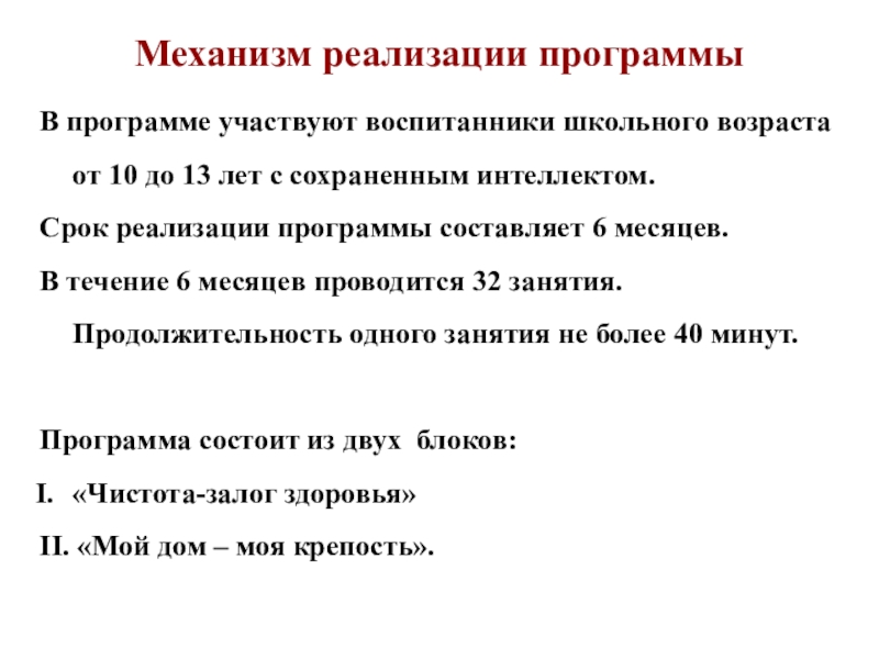 В течение 6 месяцев проводится 32 занятия. Продолжительность одного занятия не более 40 минут.