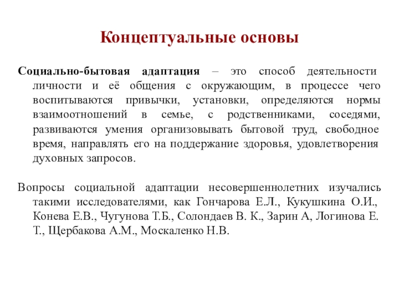 Вопросы социальной адаптации несовершеннолетних изучались такими исследователями, как Гончарова Е.Л., Кукушкина О.И., Конева Е.В., Чугунова Т.Б., Солондаев В. К., Зарин А, Логинова Е.Т., Щербакова А.М., Москаленко Н.В.