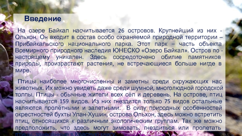 Ольхон. Он входит в состав особо охраняемой природной территории – Прибайкальского национального парка. Этот парк – часть объекта Всемирного природного наследия ЮНЕСКО «Озеро Байкал». Остров по - настоящему уникален. Здесь сосредоточено обилие памятников природы, произрастают растения, не встречающиеся больше нигде в мире.