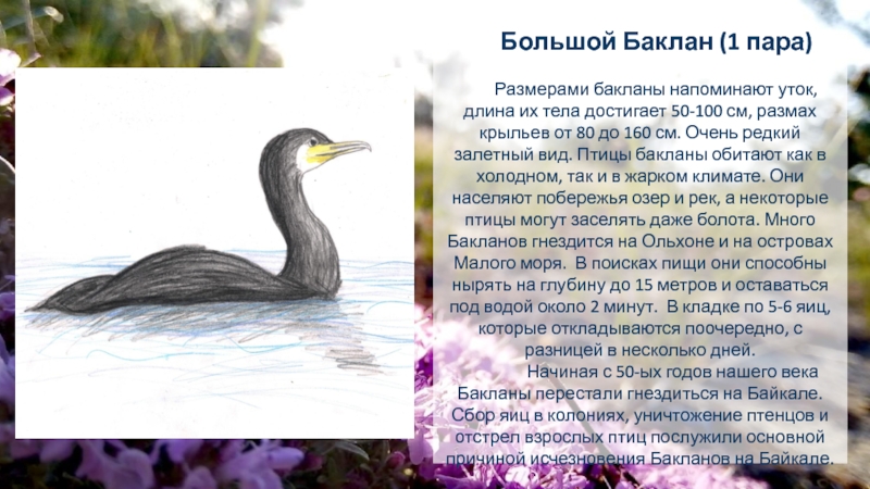 см, размах крыльев от 80 до 160 см. Очень редкий залетный вид. Птицы бакланы обитают как в холодном, так и в жарком климате. Они населяют побережья озер и рек, а некоторые птицы могут заселять даже болота. Много Бакланов гнездится на Ольхоне и на островах Малого моря. В поисках пищи они способны нырять на глубину до 15 метров и оставаться под водой около 2 минут. В кладке по 5-6 яиц, которые откладываются поочередно, с разницей в несколько дней.