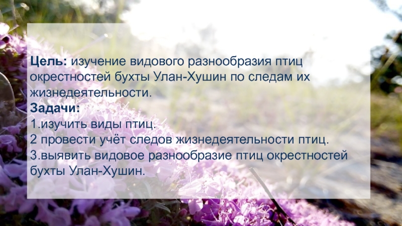 Цель: изучение видового разнообразия птиц окрестностей бухты Улан-Хушин по следам их