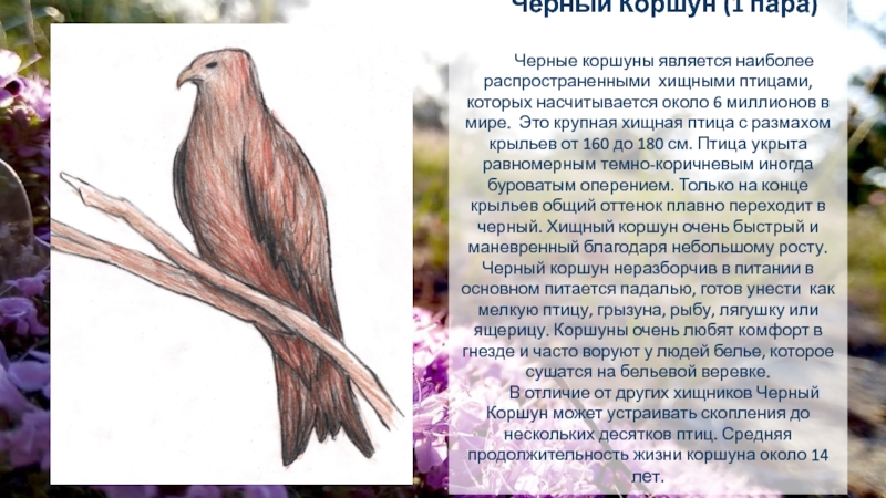 насчитывается около 6 миллионов в мире. Это крупная хищная птица с размахом крыльев от 160 до 180 см. Птица укрыта равномерным темно-коричневым иногда буроватым оперением. Только на конце крыльев общий оттенок плавно переходит в черный. Хищный коршун очень быстрый и маневренный благодаря небольшому росту. Черный коршун неразборчив в питании в основном питается падалью, готов унести как мелкую птицу, грызуна, рыбу, лягушку или ящерицу. Коршуны очень любят комфорт в гнезде и часто воруют у людей белье, которое сушатся на бельевой веревке.