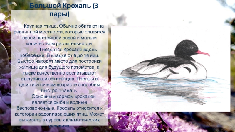 Основным кормом крохалей является рыба и водные беспозвоночные. Крохаль относится к категории водоплавающих птиц. Может выживать в суровых климатических условиях.