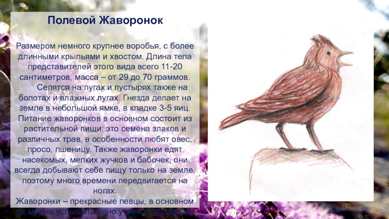 Жаворонки – прекрасные певцы, в основном их можно услышать рано утром и под вечер.