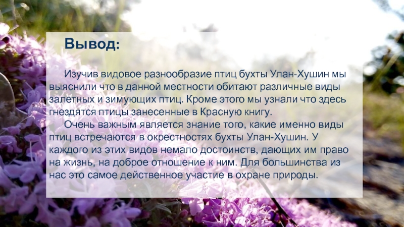 Очень важным является знание того, какие именно виды птиц встречаются в окрестностях бухты Улан-Хушин. У каждого из этих видов немало достоинств, дающих им право на жизнь, на доброе отношение к ним. Для большинства из нас это самое действенное участие в охране природы.