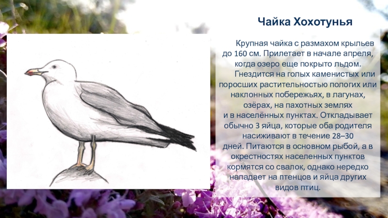 Крупная чайка с размахом крыльев до 160 см. Прилетает в