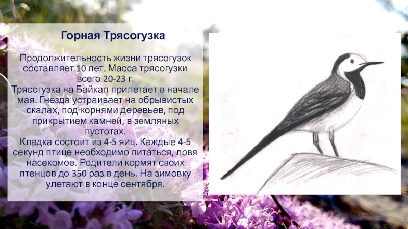 Продолжительность жизни трясогузок составляет 10 лет. Масса трясогузки всего 20-23
