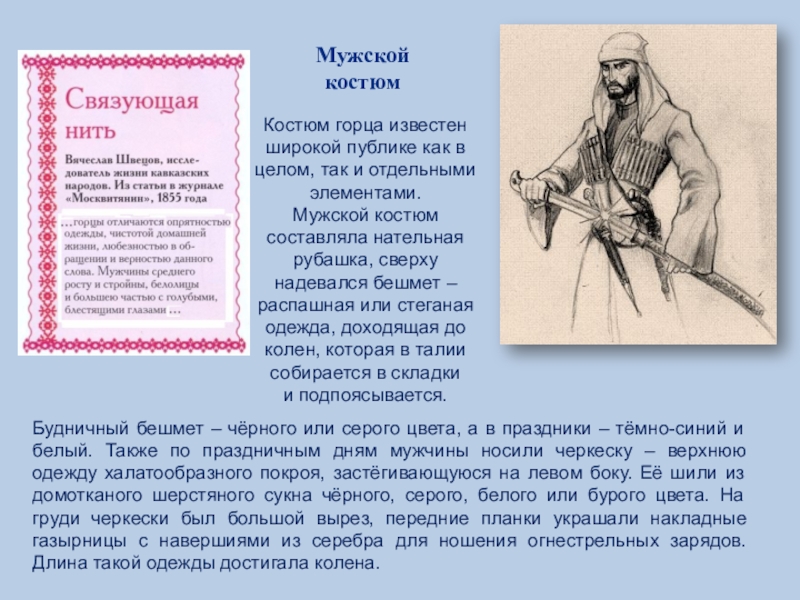 Будничный бешмет – чёрного или серого цвета, а в праздники – тёмно-синий и белый. Также по праздничным дням мужчины носили черкеску – верхнюю одежду халатообразного покроя, застёгивающуюся на левом боку. Её шили из домотканого шерстяного сукна чёрного, серого, белого или бурого цвета. На груди черкески был большой вырез, передние планки украшали накладные газырницы с навершиями из серебра для ношения огнестрельных зарядов. Длина такой одежды достигала колена.