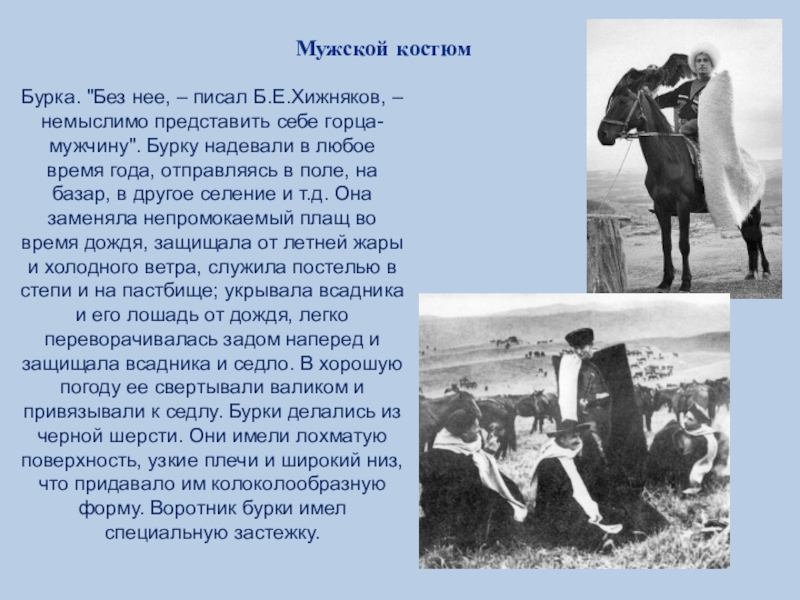 Невозможно представить себе мужчину-горца без лошади; уже в пять лет мальчика сажали на неоседланную лошадь. Самой лучшей оценкой деда внуку было: “Ты – как шкура коня!”