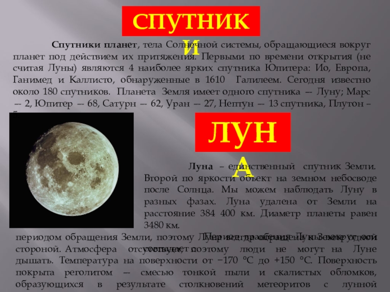 периодом обращения Земли, поэтому Луна всегда обращена к Земле одной стороной. Атмосфера отсутствует, поэтому люди не могут на Луне дышать. Температура на поверхности от −170 °C до +150 °C. Поверхность покрыта реголитом — смесью тонкой пыли и скалистых обломков, образующихся в результате столкновений метеоритов с лунной поверхностью.