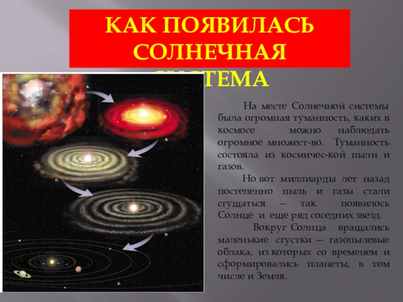 Вокруг Солнца вращались маленькие сгустки — газопылевые облака, из которых со временем и сформировались планеты, в том числе и Земля.