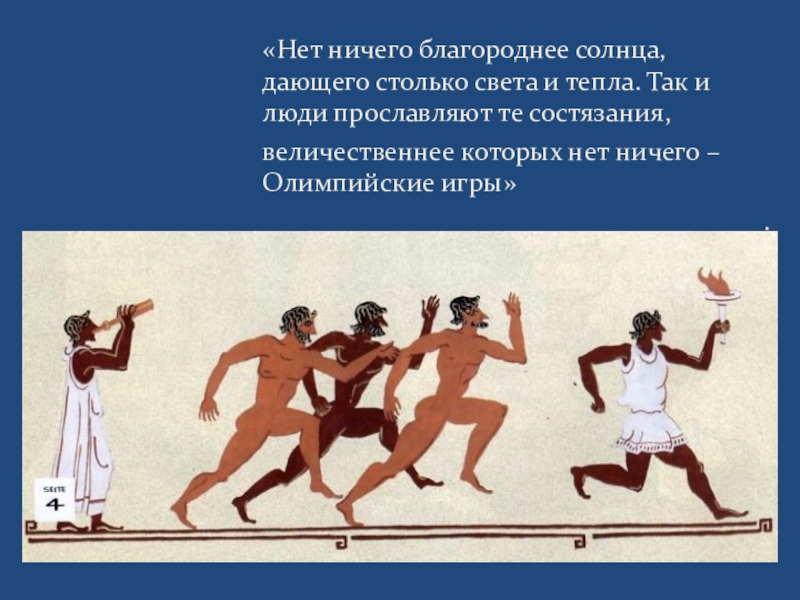 «Нет ничего благороднее солнца, дающего столько света и тепла. Так и люди прославляют те состязания,величественнее которых нет ничего – Олимпийские игры».