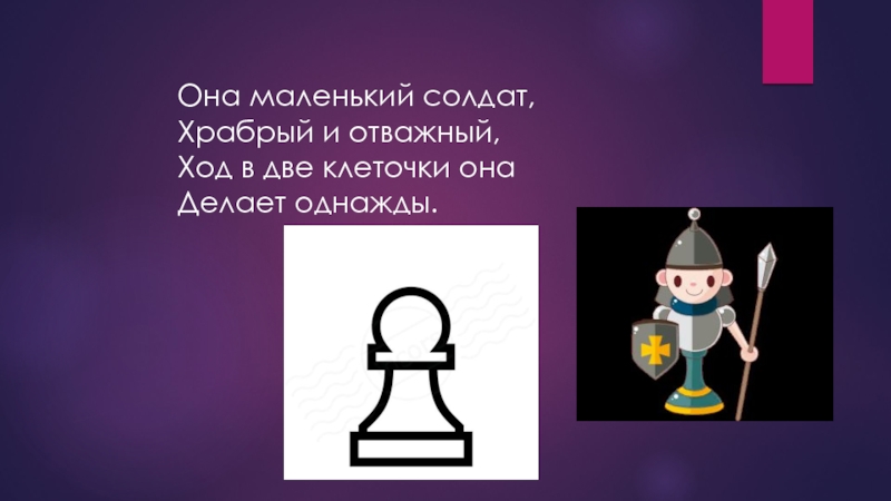 Она маленький солдат,Храбрый и отважный,Ход в две клеточки онаДелает однажды.