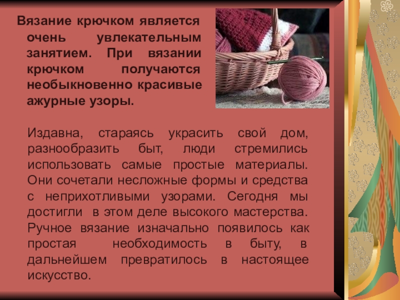 Издавна, стараясь украсить свой дом, разнообразить быт, люди стремились использовать самые простые материалы. Они сочетали несложные формы и средства с неприхотливыми узорами. Сегодня мы достигли в этом деле высокого мастерства. Ручное вязание изначально появилось как простая необходимость в быту, в дальнейшем превратилось в настоящее искусство.