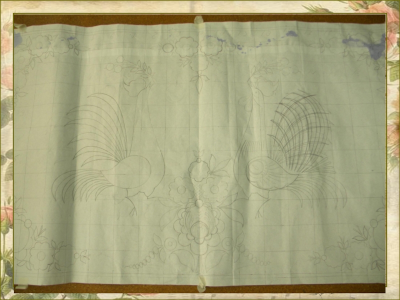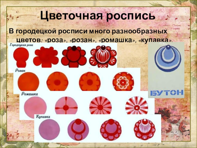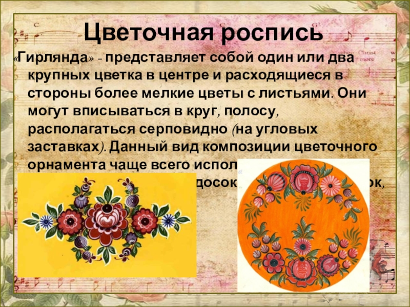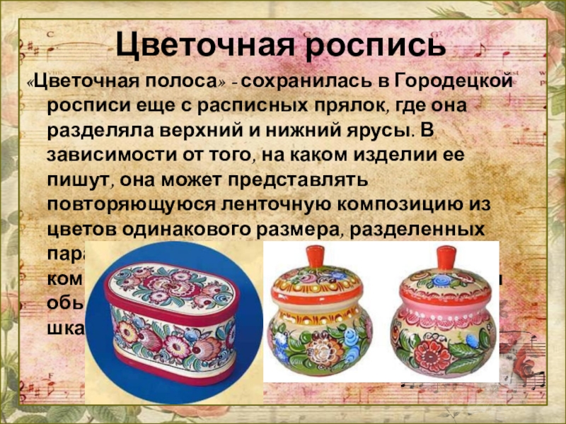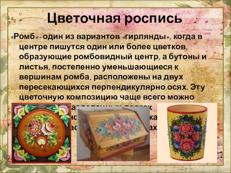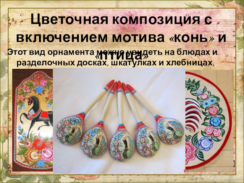 «Букет» изображается симметрично. Как правило, пишется на разделочных досках или блюдах. Небольшие букетики из одного - трех цветков можно увидеть на мелких изделиях, таких, как коробочки, стаканчики, солонки.