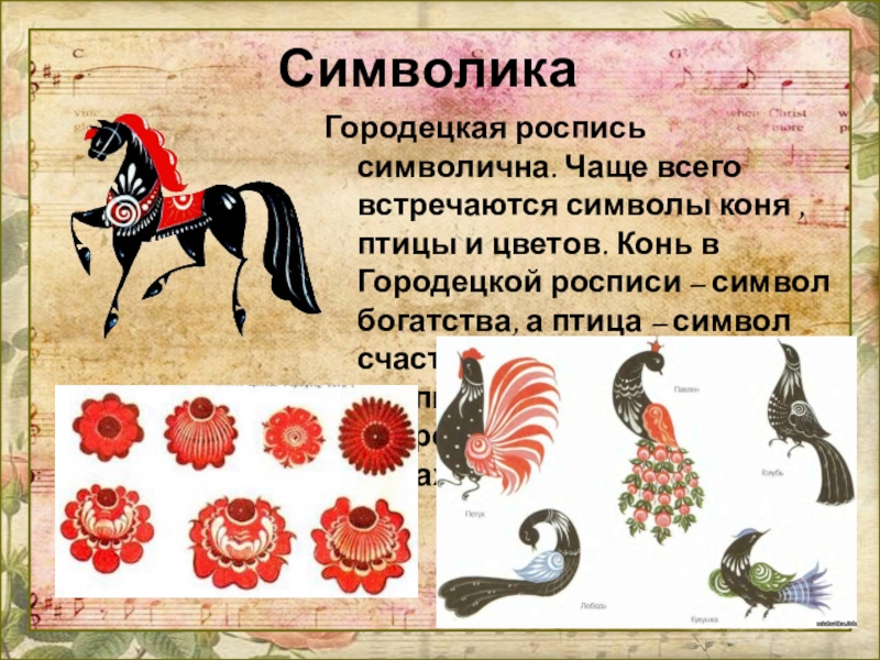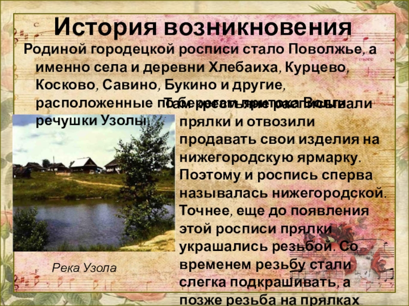 Родиной городецкой росписи стало Поволжье, а именно села и деревни Хлебаиха, Курцево, Косково, Савино, Букино и другие, расположенные по берегам притока Волги речушки Узолы.