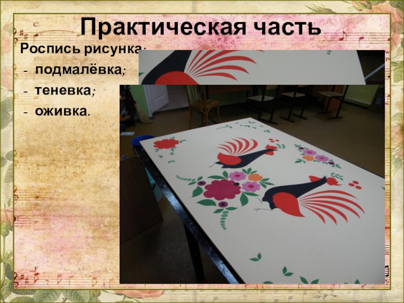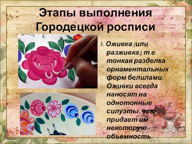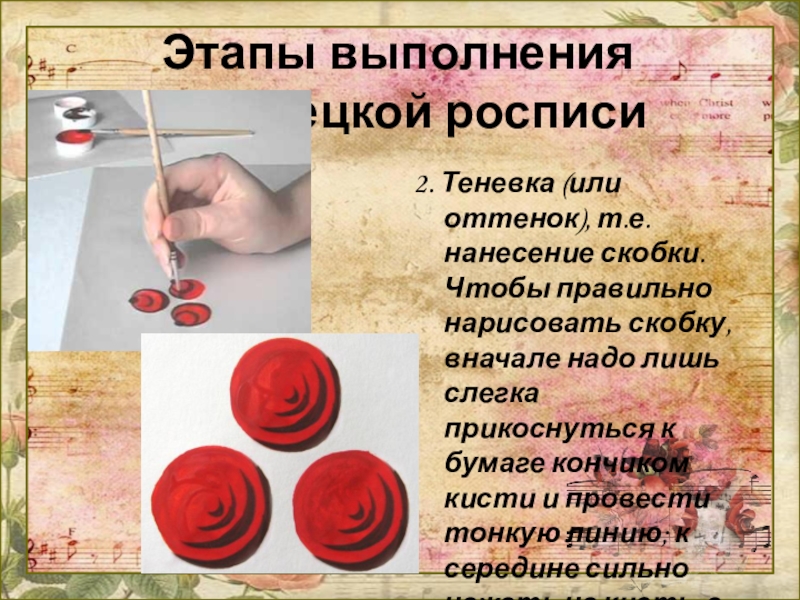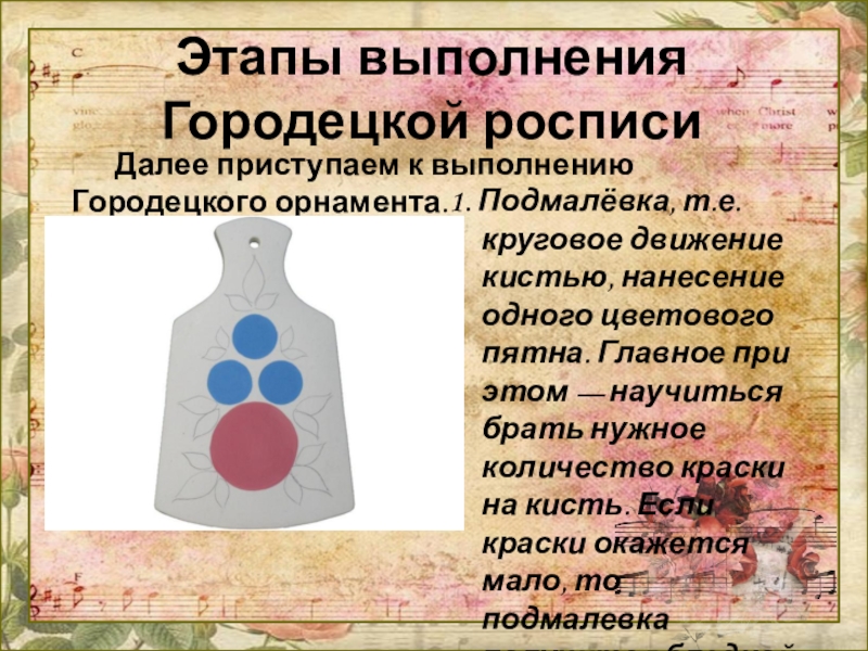 1. Подмалёвка, т.е. круговое движение кистью, нанесение одного цветового пятна. Главное при этом — научиться брать нужное количество краски на кисть. Если краски окажется мало, то подмалевка получится бледной, невыразительной.