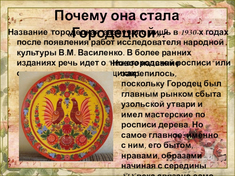 Новое название закрепилось, поскольку Городец был главным рынком сбыта узольской утвари и имел мастерские по росписи дерева. Но самое главное: именно с ним, его бытом, нравами, образами начиная с середины XIX века связано само содержание росписи.