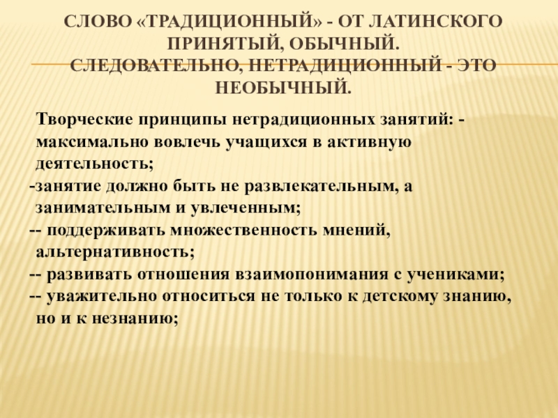 Творческие принципы нетрадиционных занятий: - максимально вовлечь учащихся в активную деятельность;