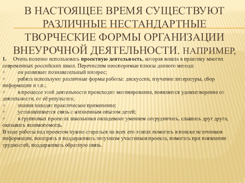 1. Очень полезно использовать проектную деятельность, которая вошла в практику многих современных российских школ. Перечислим неоспоримые плюсы данного метода: