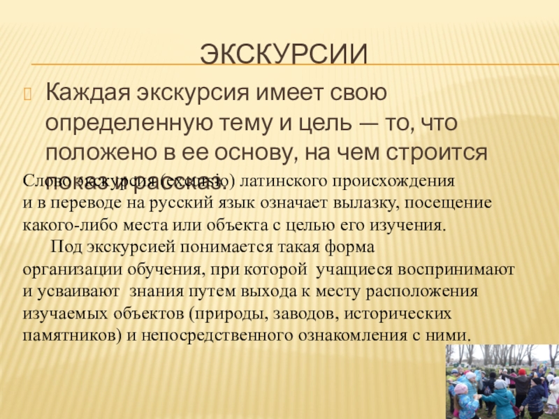 Под экскурсией понимается такая форма организации обучения, при которой учащиеся воспринимают и усваивают знания путем выхода к месту расположения изучаемых объектов (природы, заводов, исторических памятников) и непосредственного ознакомления с ними.