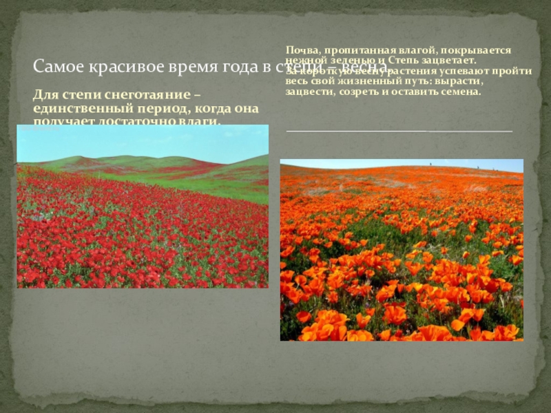 Почва, пропитанная влагой, покрывается нежной зеленью и Степь зацветает.