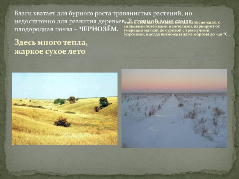 Зима в степных регионах всегда малоснежная, с сильными позёмками и метелями, варьирует от умеренно мягкой до суровой с трескучими морозами, иногда возможны даже морозы до −40 °C..
