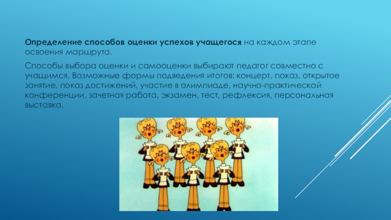 Слайд 15Определение способов оценки успехов учащегося на каждом этапе освоения маршрута.