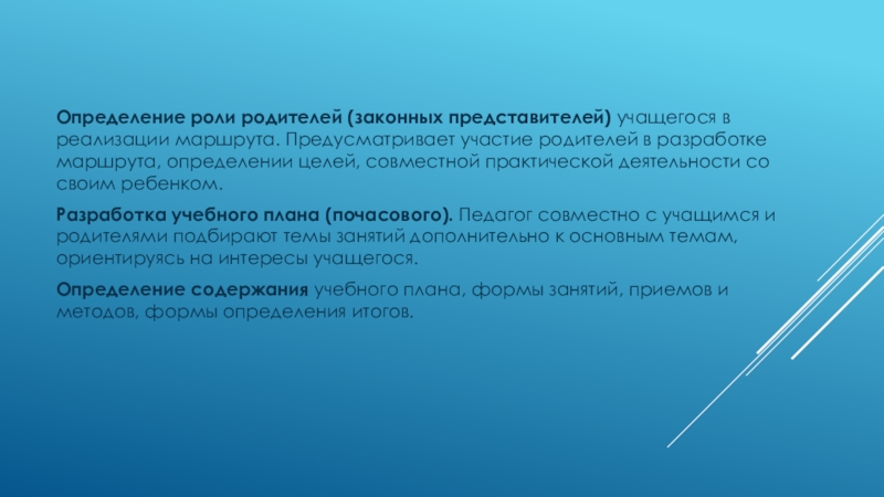 Слайд 14Определение роли родителей (законных представителей) учащегося в реализации маршрута. Предусматривает участие