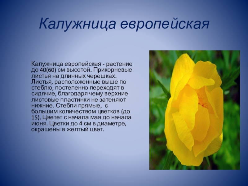Калужница европейская - растение до 40(60) см высотой. Прикорневые листья