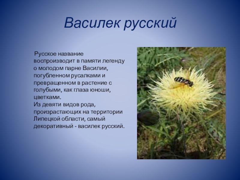 Из девяти видов рода, произрастающих на территории Липецкой области, самый декоративный - василек русский.